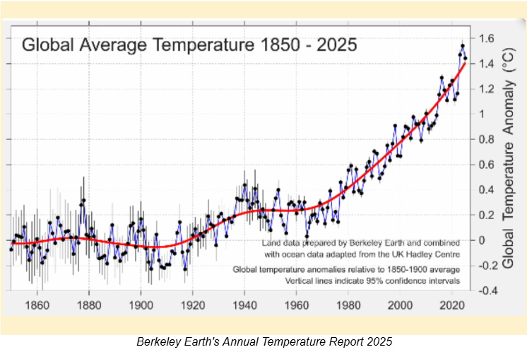 2025 foi o terceiro ano mais quente já registrado na história. De acordo com o relatório anual de temperatura da Berkeley Earth, a média global ficou apenas 0,01°C abaixo de 2023, e 0,13°C abaixo de 2024.